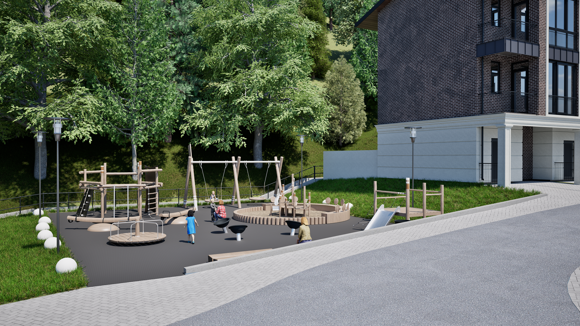 Внутренний двор сделан в виде парка, для детей оборудованы современные игровые площадки с безопасным покрытием и установлены развивающие городки